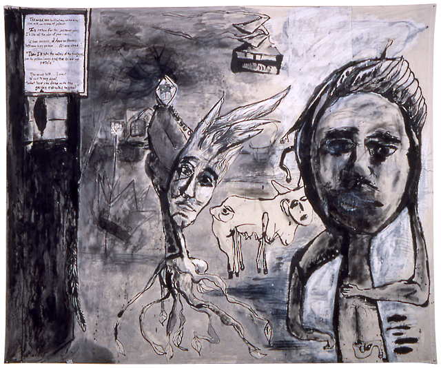 Ink and collage on cotton bedsheet, 72" X 96", 1990