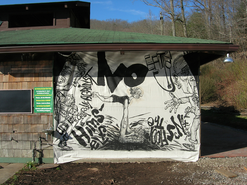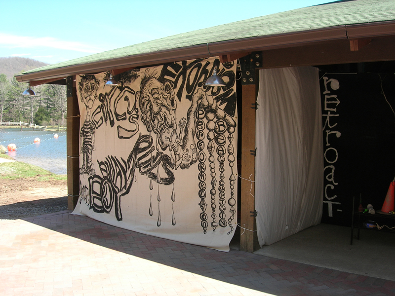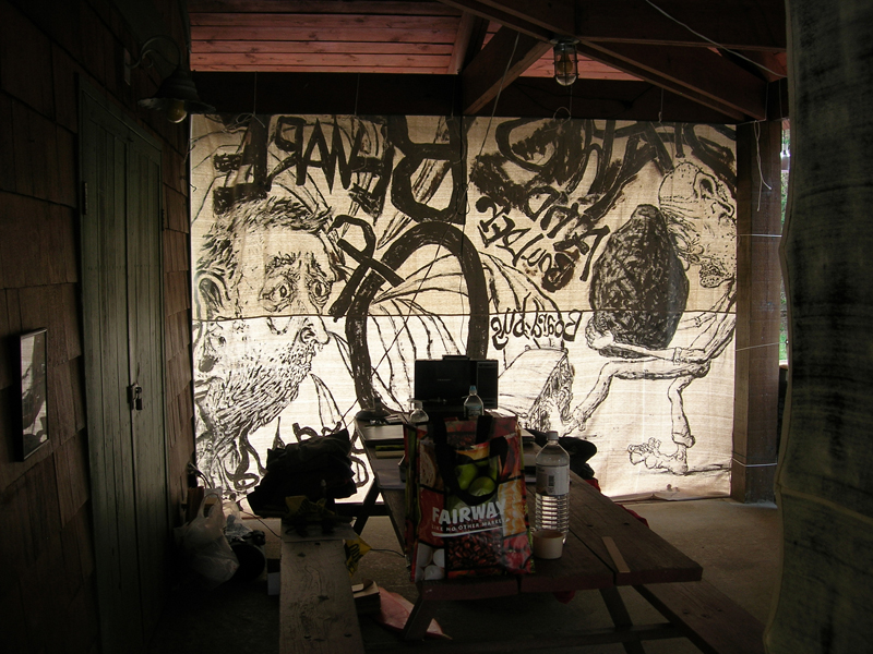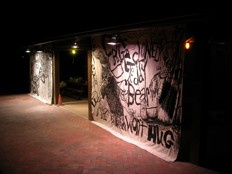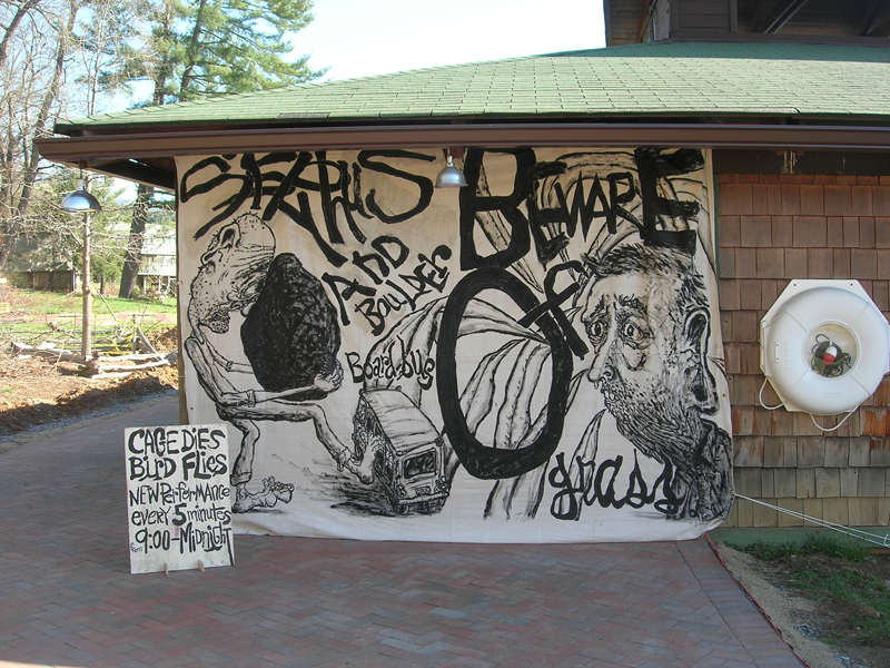 | The original {Re}HAPPENING proposal entailed an installation of selected "Cage Dies" paintings that would serve as stage for a performance. Ben Miller and I would paddle to the exhibition site across a lake in a canoe, sing antic renditions of the words in the paintings, noisily run back to the canoe, and return to the other side of the lake. When we were assigned a lakeside boathouse as our performance area - not conducive to the display of artworks on paper - our project changed. I created four 9' X 12' paintings, executed on painter's drop cloths in black acryilc paint, that each combined two of the original "Cage Dies" artworks. The large paintings were lashed to the posts surrounding the boathouse creating a central stage area. The performance lasted the entire evening: a new word-picture was performed every five minutes from just before 9:00 pm until midnight. |