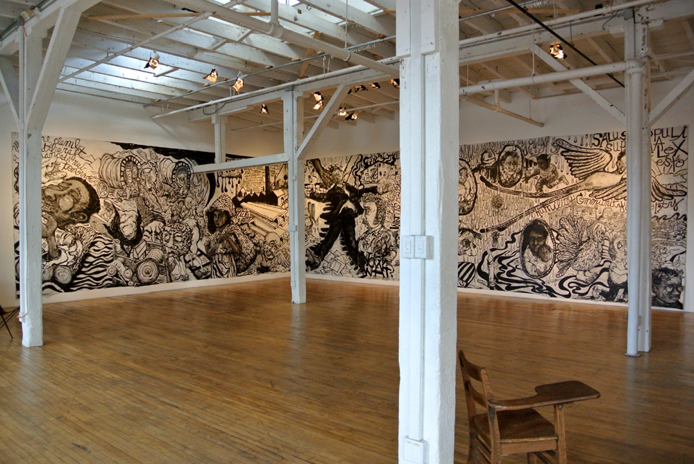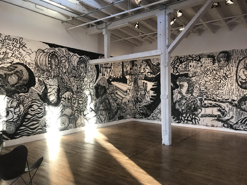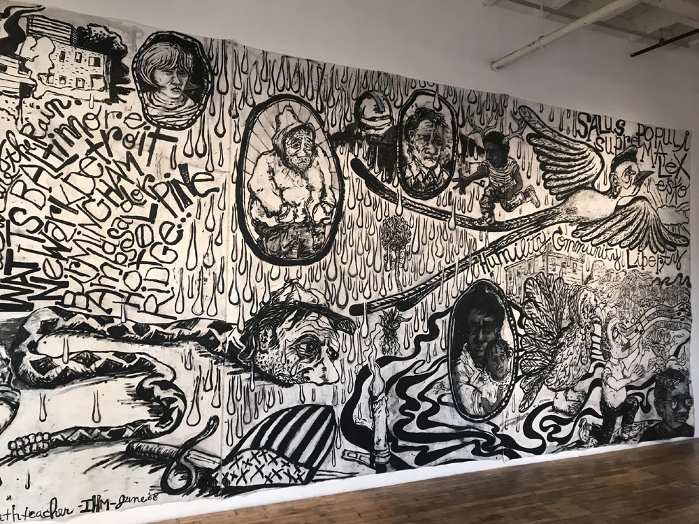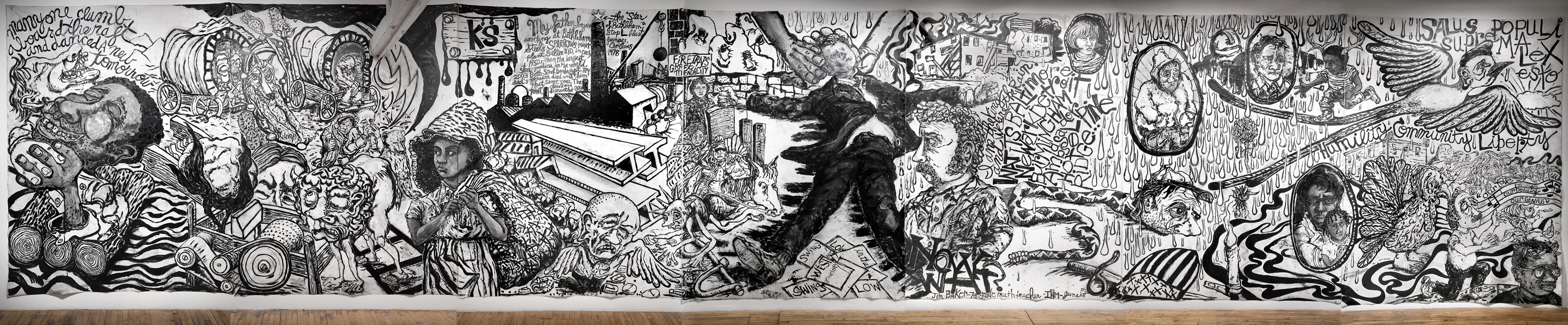 acrylic and charcoal on canvas in 7 sections, 11' X 56', 2018.
